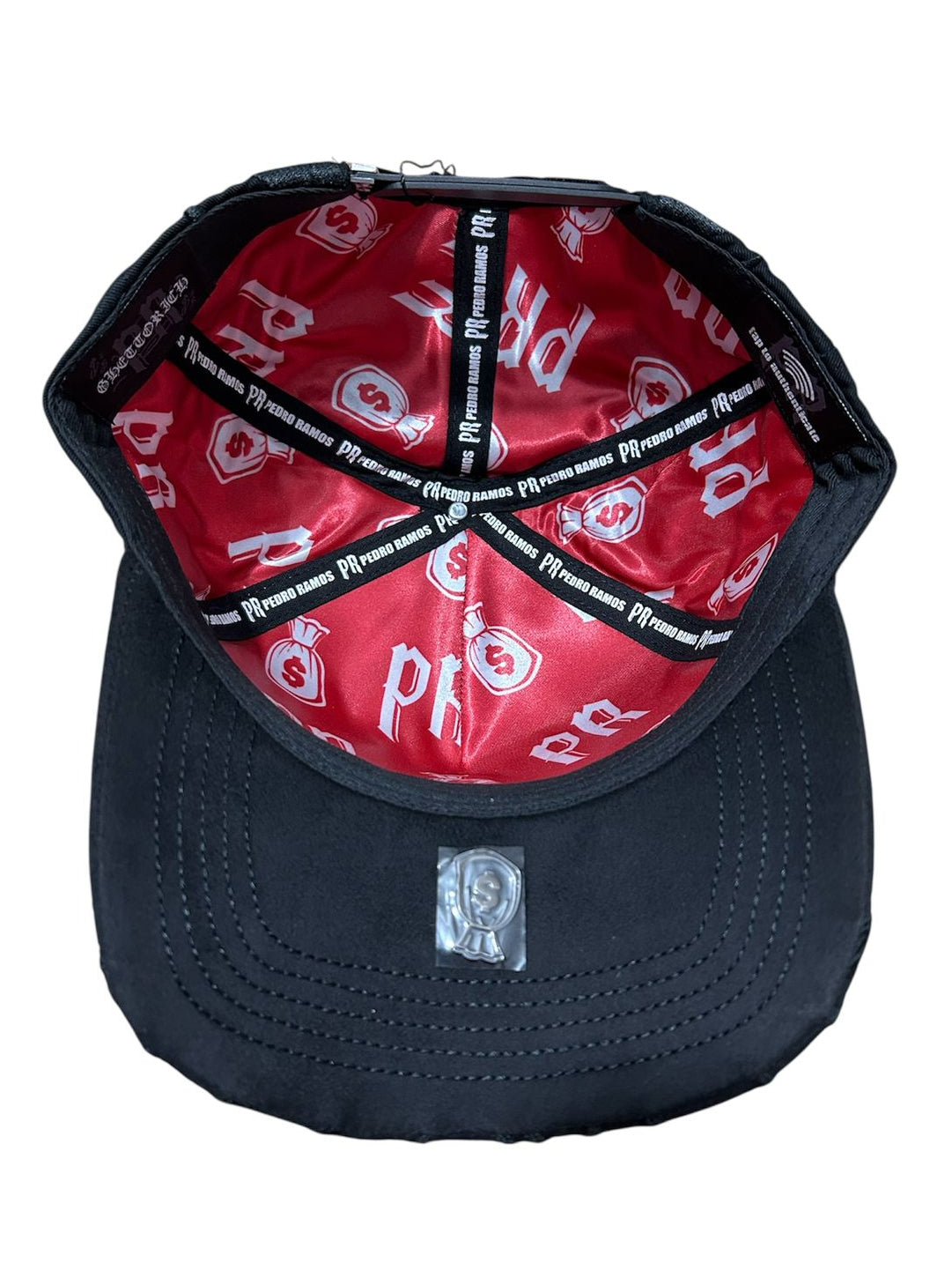 -FORRO INTERIOR PERSONALIZADO EN SATIN ROJO CON LOGOTIPO PR Y COSTALES DE DINERO, REFLEJANDO EL ADN DE LA MARCA.